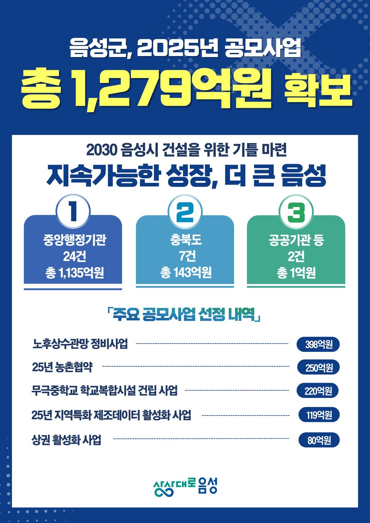 음성군은 지난해 총 33건의 공모사업에 선정돼 총 1279억원에 달하는 대규모 사업비를 확보했다고 20일 밝혔다.