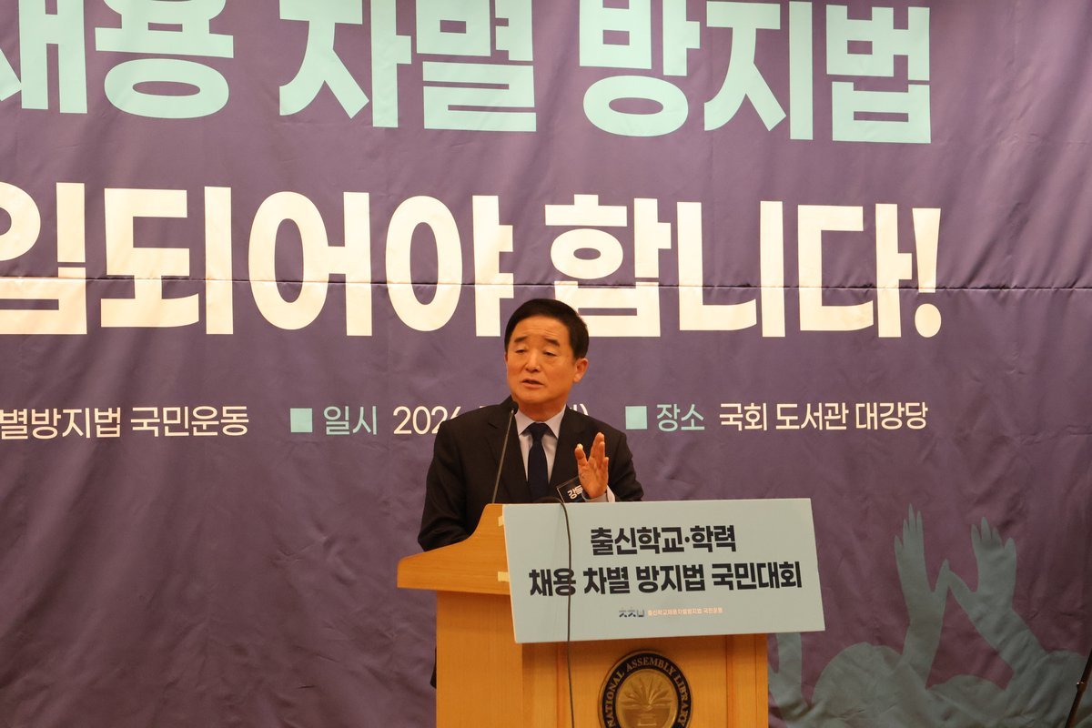 20일 국회도서관 대강당에서 열린 '출신학교 채용 차별 방지법 추진 국민대회'에는 강득구 의원과 300여개 시민단체 관계자는 물론이고 교육부 최교진 장관, 고용노동부 김영훈 장관, 국가교육위원회 차정인 위원장, 서울특별시교육청 정근식 교육감 등이 참석했다.