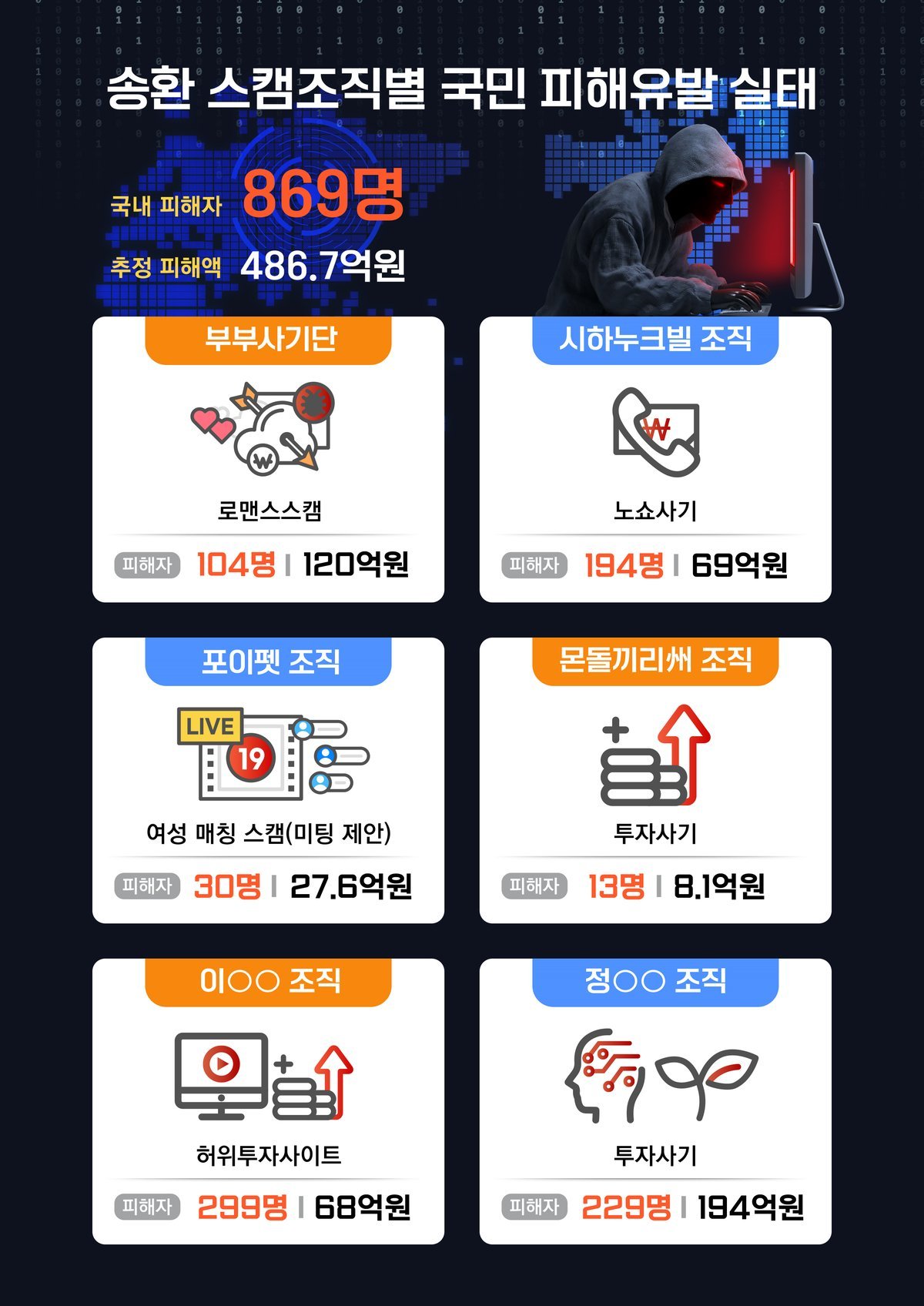 캄보디아 현지에 파견된 코리아전담반, 국정원, 현지 캄보디아 경찰 등은 장기간에 걸친 추적 끝에 스캠 단지 7곳을 확인하고, 작년 12월 시하누크빌 스캠조직 51명, 포이팻 스캠조직 15명, 몬돌끼리 스캠조직 26명 등을 검거하는 성과를 거뒀습니다.