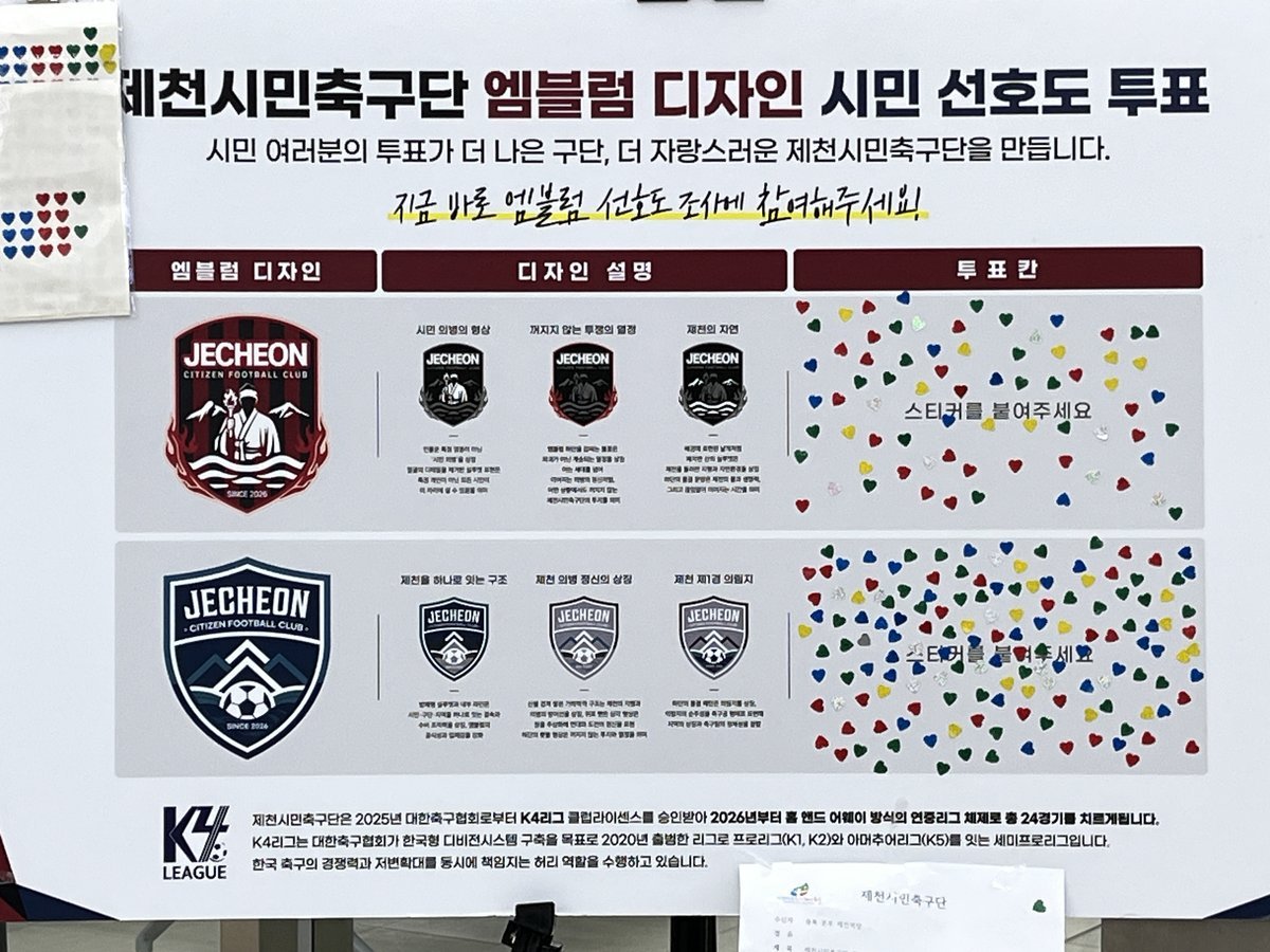 [국회의정저널] 제천시민축구단은 구단의 정체성과 가치를 시민과 함께 만들어가기 위해 선정위원회의 심사와 시민 공개투표를 연계한 2단계 절차를 거쳐 공식 엠블럼을 선정했다.