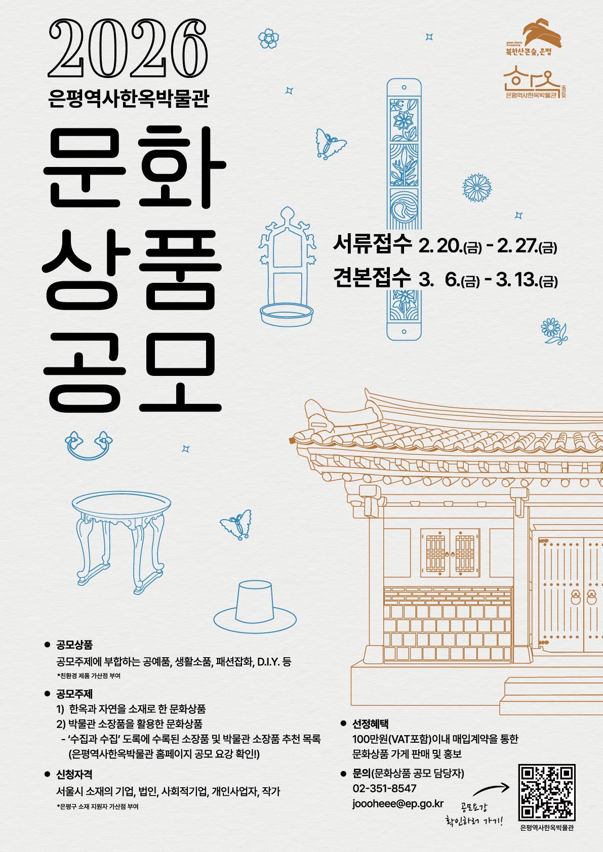 [국회의정저널] 서울 은평구는 오는 2월 20일부터 '2026 은평역사한옥박물관 문화상품 공모전'을 개최한다고 밝혔다.
