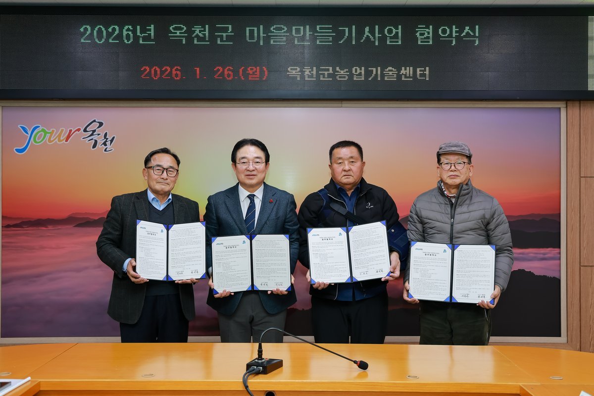 [국회의정저널] 옥천군은 1월 26일 오후 2시, 옥천군농업기술센터 2층 소회의실에서 ‘2026년 옥천군 마을만들기사업 협약식’을 열고 동이면 금암2리, 안남면 도덕1리, 청산면 한곡리 등 3개 마을과 협약을 체결했다.