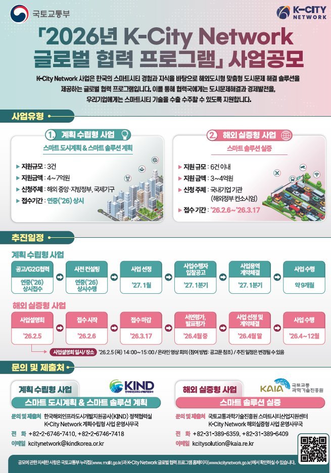[국회의정저널] 정부가 국내 스마트도시 기술의 해외 진출을 지원하기 위해 올해「K-City 네트워크 글로벌 협력 사업*」 공모를 추진한다. 이번 사업을 통해 기업들은 해외 도시에서 자사 기술을 직접 실증하고, 현지 여건에 맞는 사업 모델을 검증해 실제 수주와 사업화로 이어질 수 있는 기회를 얻게 된다.