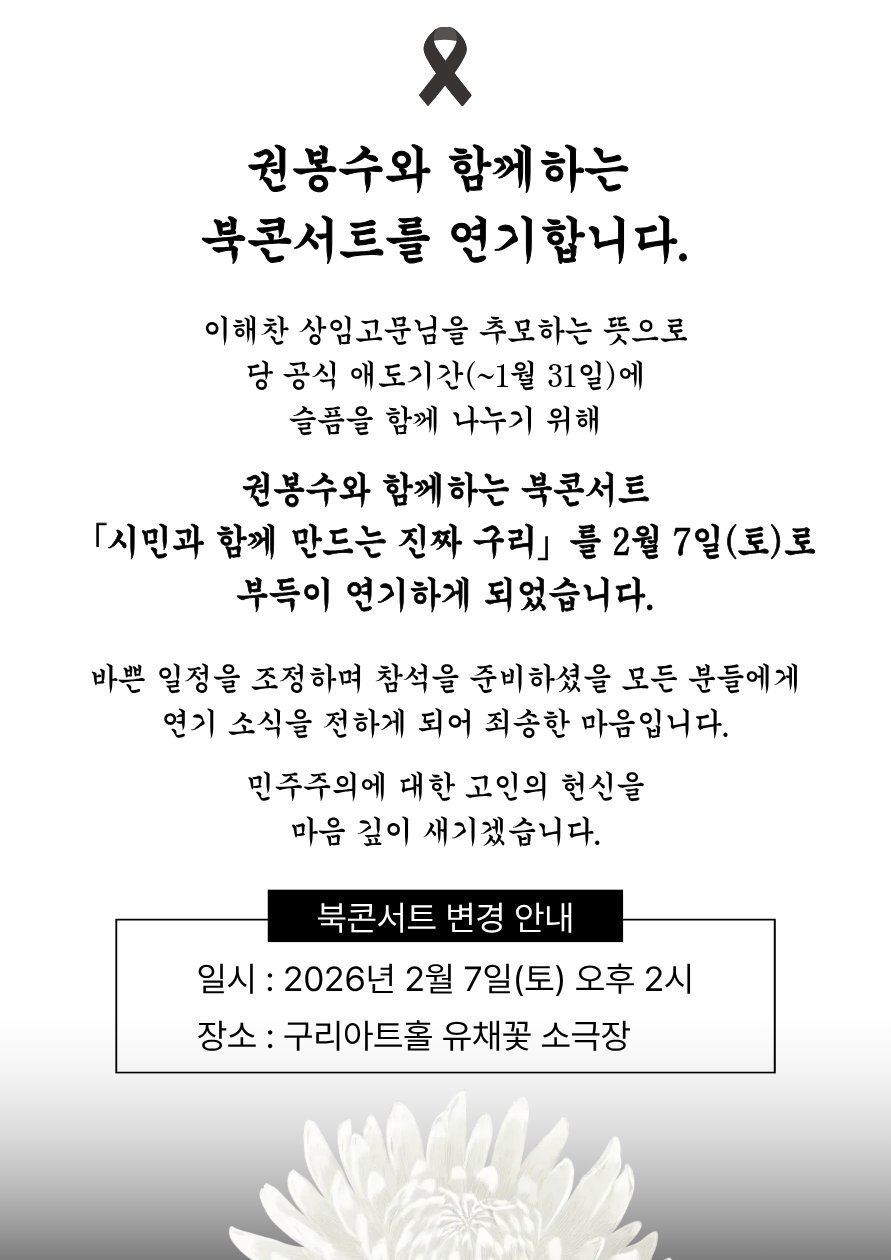 권봉수 구리시의원은 27일 자신의 페이스북에 "이해찬 상임고문님을 추모하는 뜻으로 당 공식 애도기간에 슬픔을 함께 나누기 위해 북콘서트를 2월 7일로 연기한다"며 양해를 구했다.