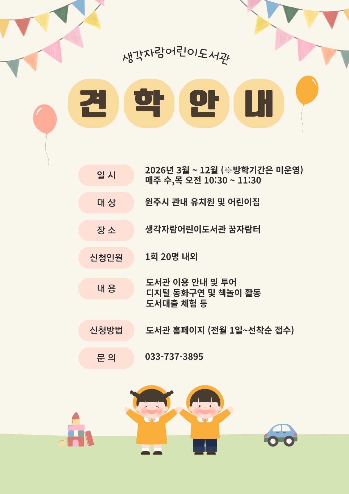 [국회의정저널] 원주시 생각자람어린이도서관은 오는 3월부터 12월까지 관내 유치원과 어린이집 원아를 대상으로 견학 프로그램을 운영한다.