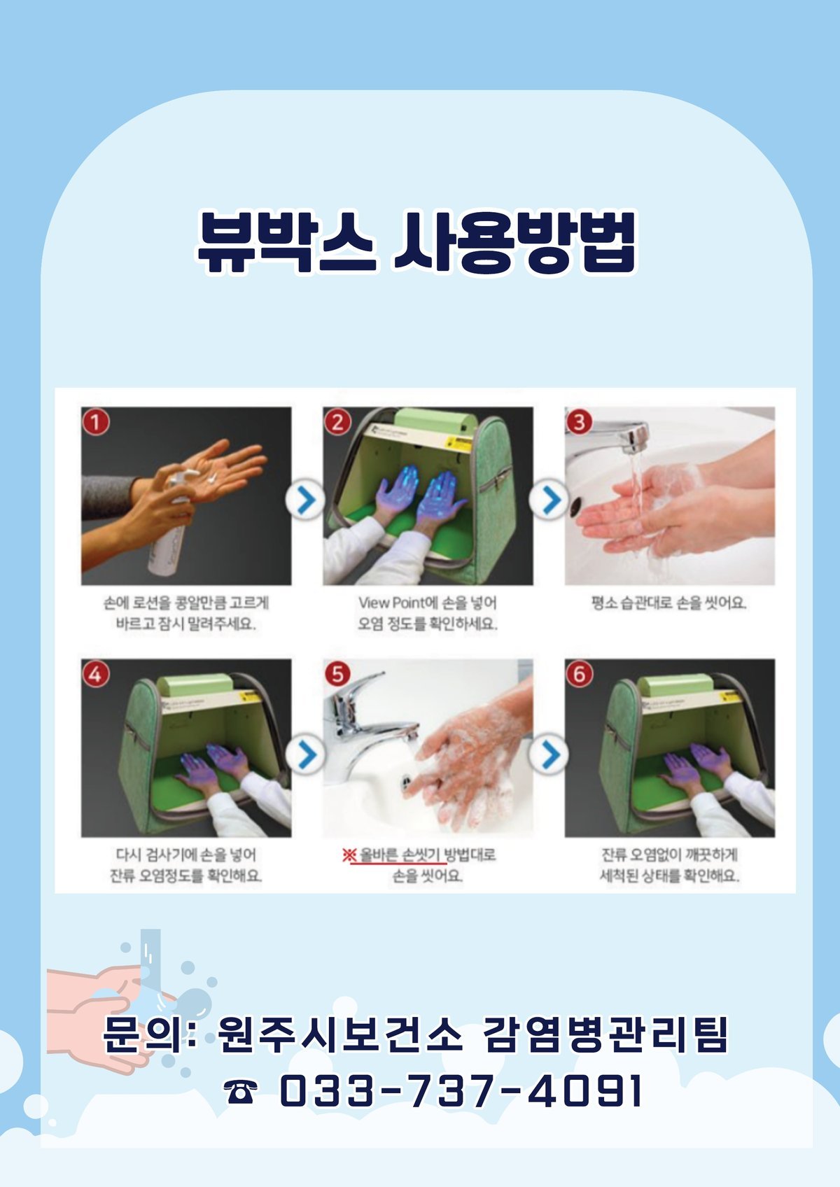 뷰박스는 세균 역할을 하는 형광 로션을 손에 바른 후 자외선 조명에 비춰 손 씻기 전후 남아있는 형광물질을 시각적으로 확인하는 장비로 손 씻기의 중요성을 효과적으로 체험할 수 있다.