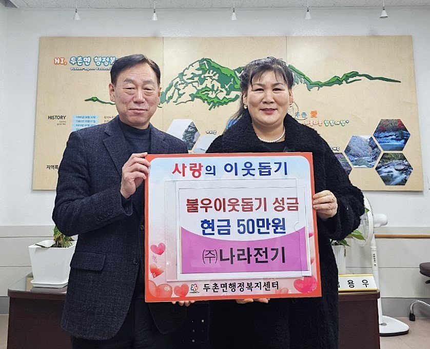 남용우 두촌면장은 “어려운 이웃을 위해 나눔을 실천해 주신 ㈜나라전기에 감사드린다”며 “기탁 성금은 두촌면 지역사회 보장협의체가 추천한 취약 가구에 잘 전달하겠다”고 말했다.