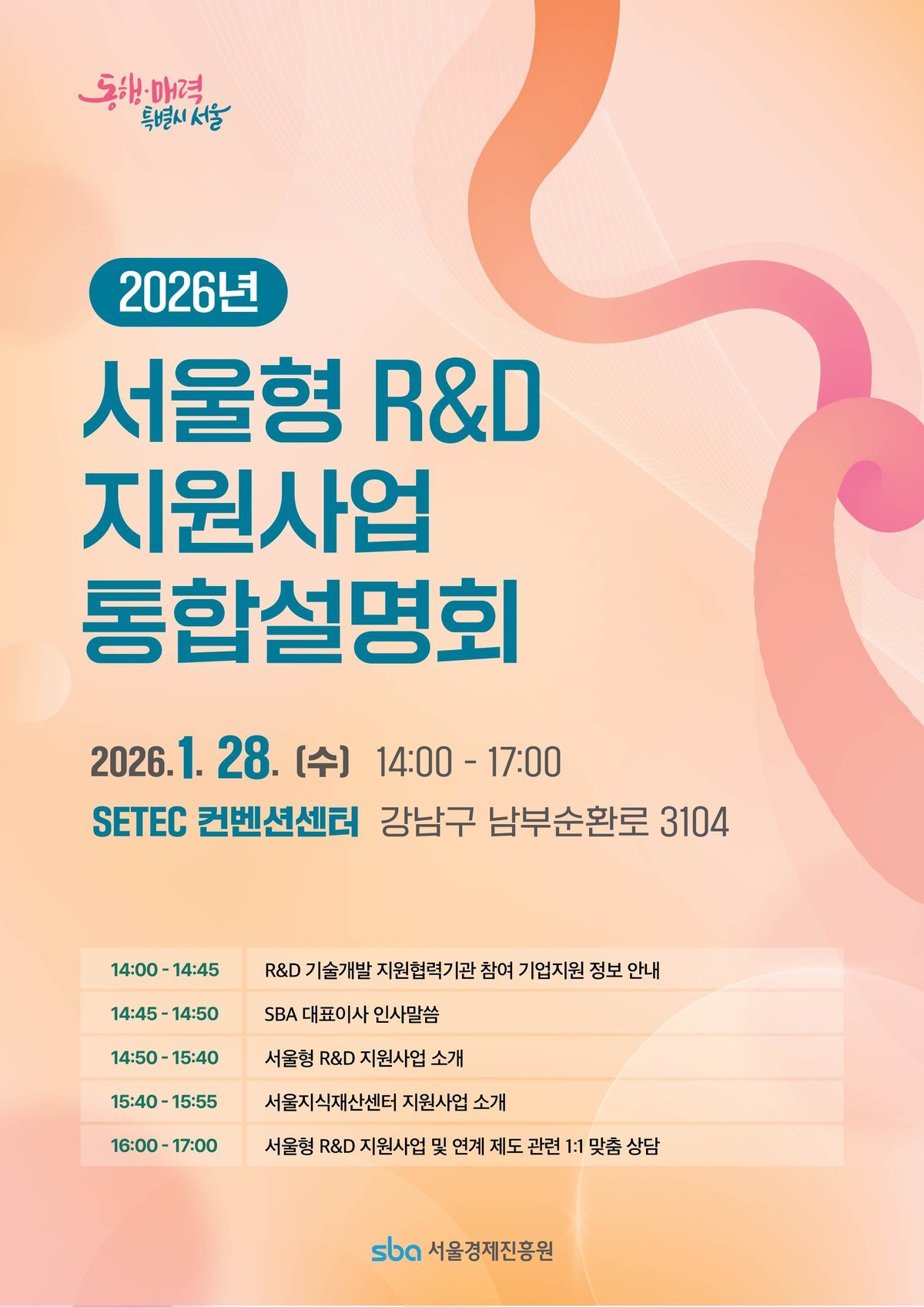한편, 시는 오는 28일 세텍에서 서울 소재 중소․벤처․창업기업 중심 산학연 컨소시엄을 대상으로 한 ‘서울형 R&D 지원사업 통합설명회’를 개최한다. 세부 사업별 자세한 사항은 ‘서울경제진흥원 R&D지원센터’ 누리집에서 확인할 수 있다.