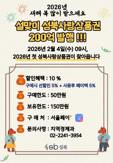 [국회의정저널] 서울 성북구가 설 명절을 앞두고 구민의 장바구니 부담을 완화하고 골목상권 활성화를 위해 오는 2월 4일 오전 9시부터 200억원 규모의 '성북사랑상품권'을 발행한다.