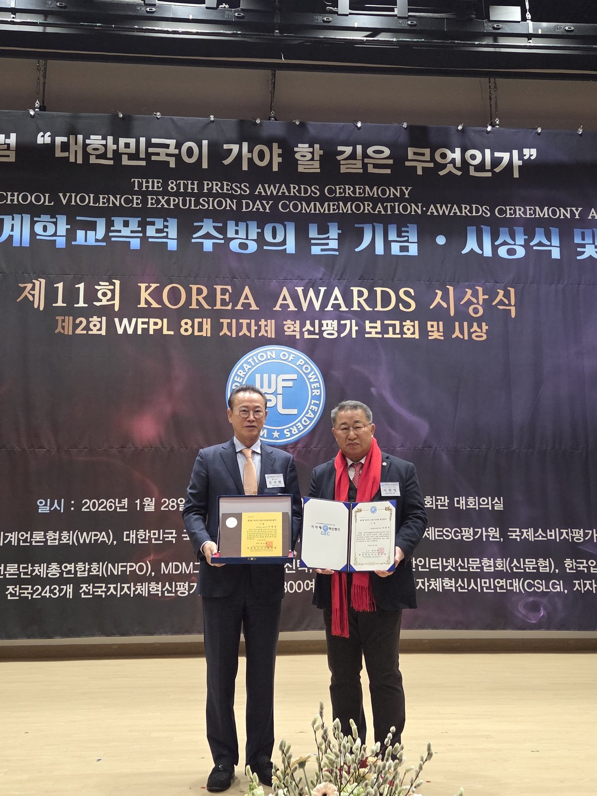 이번 시상식은 WFPL 부설 지자체 혁신평가위와 대한민국 국회가 공동 주최해 1월 28일 국회의원회관 대회의실에서 개최됐으며 이한영 운영위원장은 지자체 혁신에 기여한 공로를 인정받아 최고 영예를 안았다.