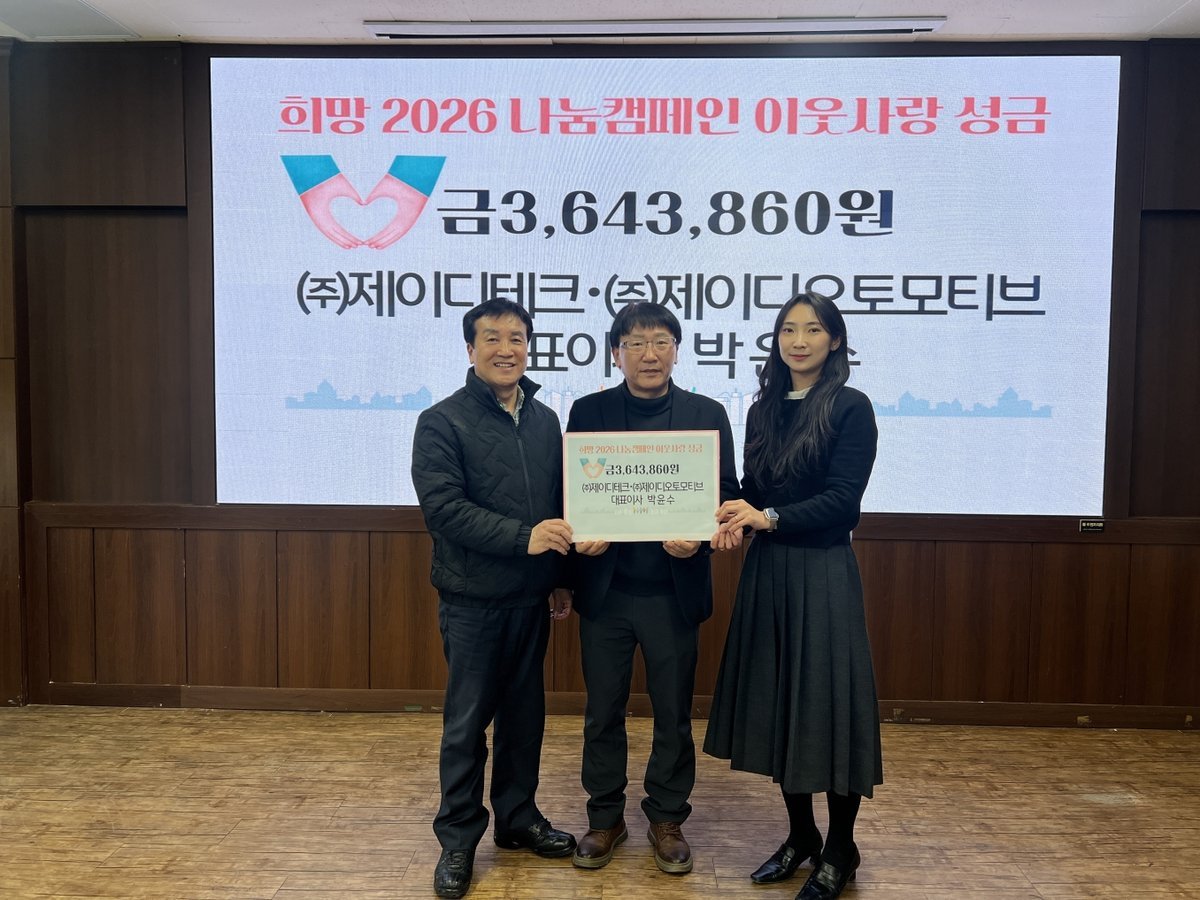 [국회의정저널] 아산시에 소재한 ㈜제이디테크·㈜제이디오토모티브는 지난 28일 둔포면 행정복지센터를 방문해 ‘희망2026나눔캠페인’이웃돕기 성금 364만 3860원을 전달했다.