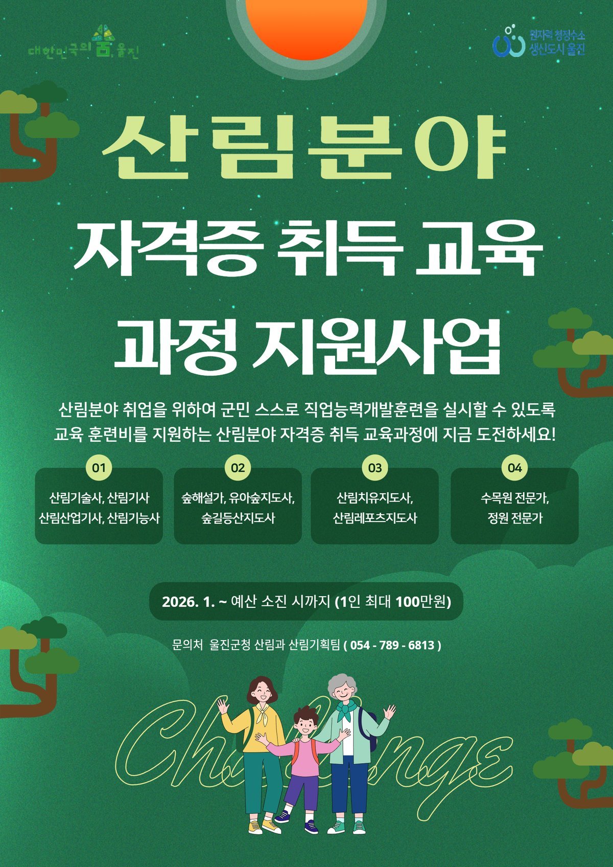 [국회의정저널] 울진군은 군민의 산림분야 취업지원을 위해 자기주도 직업능력개발훈련을 지원하는 산림분야 자격증 취득 교육과정 지원사업을 실시한다.