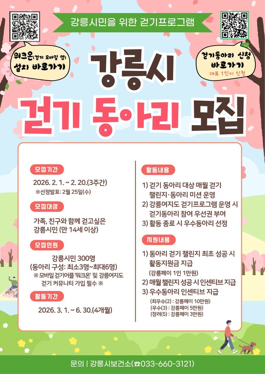 [국회의정저널] 강릉시보건소는 시민들의 건강 걷기 참여를 확대하고 걷기 생활화를 정착시키기 위해 ‘2026 행복 가득, 건강 가득’강릉시 걷기 동아리 참가자를 오는 2월 1일부터 2월 20일까지 모집한다.