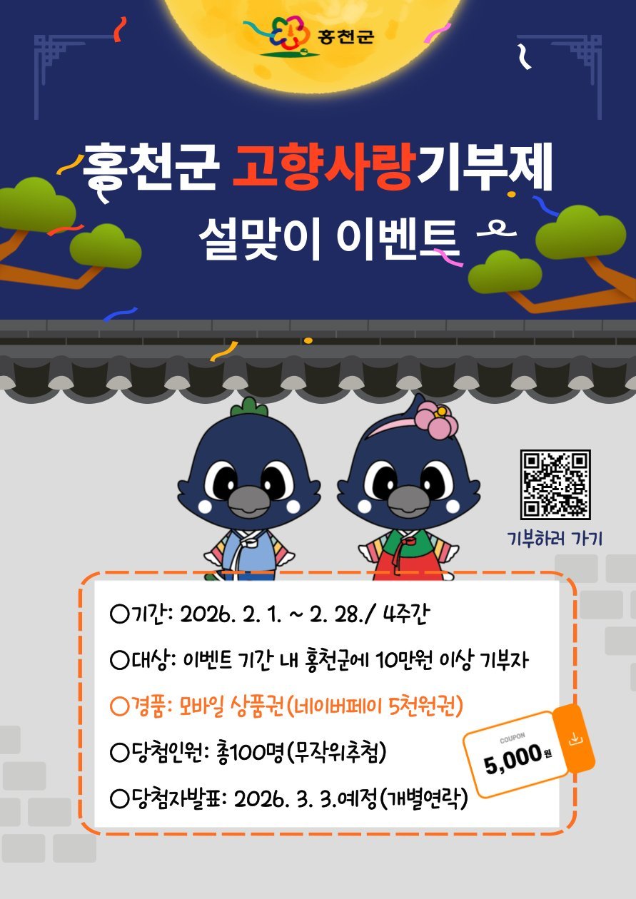 [국회의정저널] 홍천군은 2026년 설 명절을 맞아 고향사랑기부제의 활성화와 건전한 기부 문화 확산을 위해 ‘설맞이 고향사랑기부제 이벤트’를 진행한다.