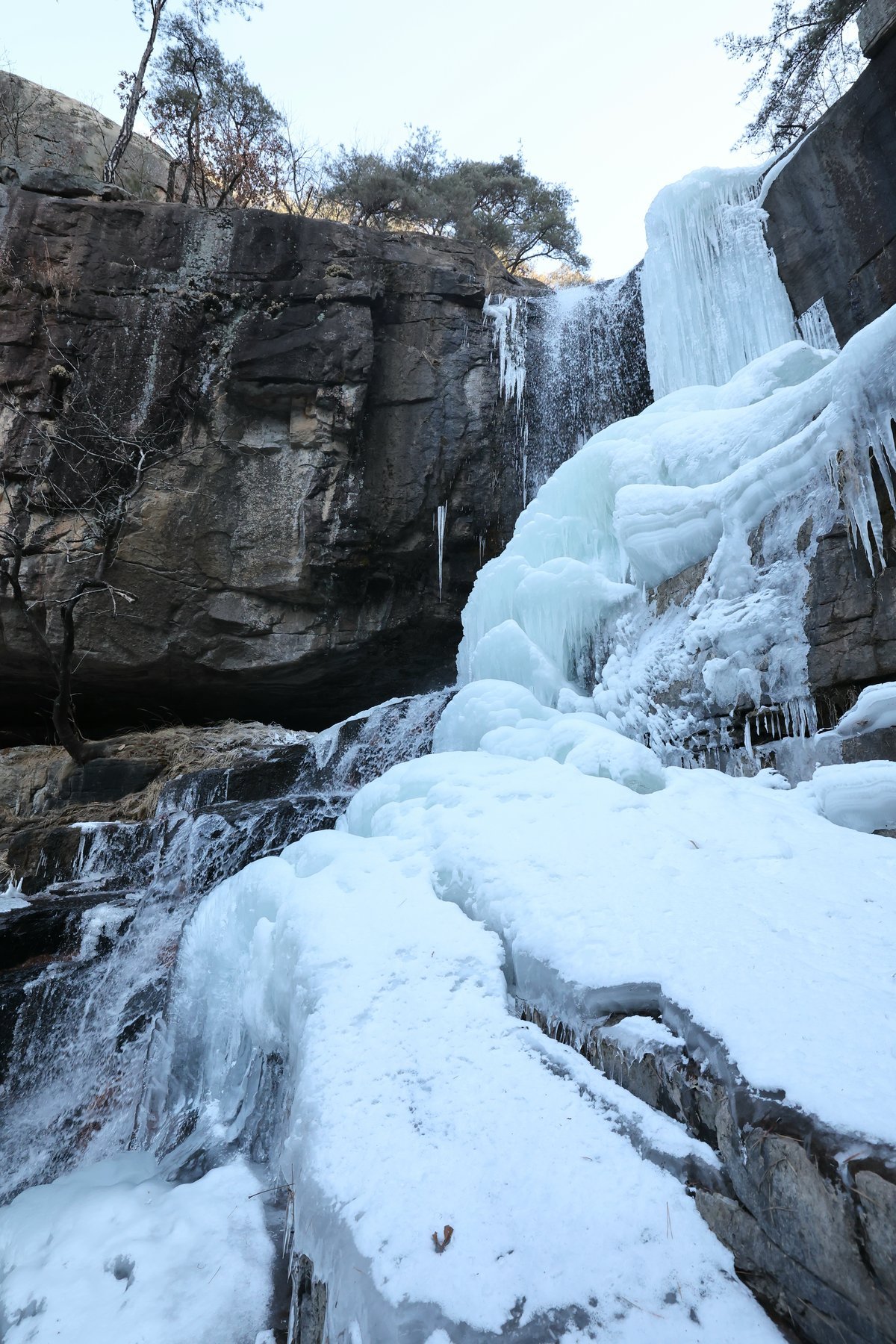 폭포 절벽을 따라 흐르던 물줄기는 얼어붙어 층층이 이어진 얼음 기둥을 형성했고 암벽 곳곳에는 고드름이 달려 웅장한 겨울 풍경을 완성했다.