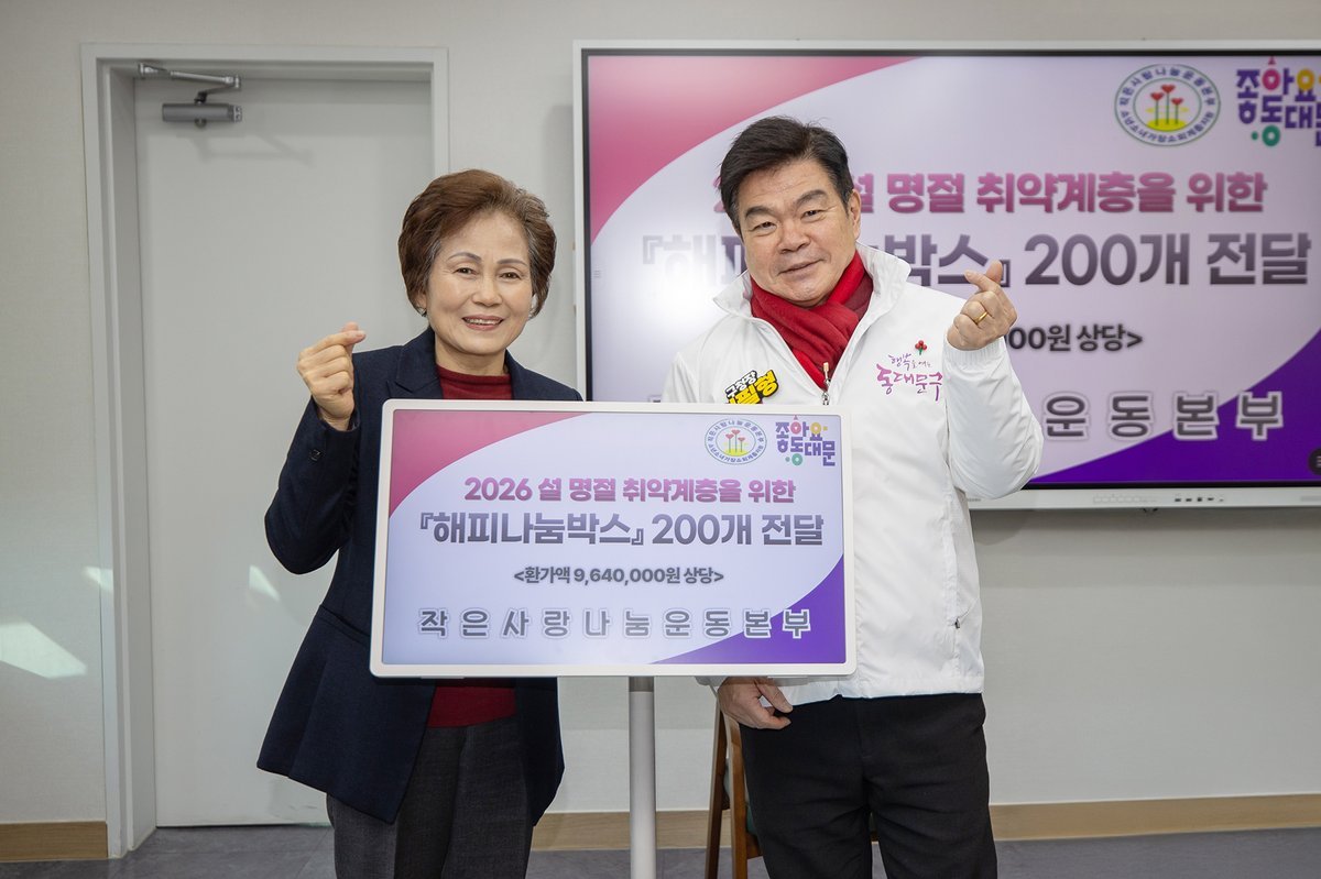 [국회의정저널] 동대문구는 29일 오전 9시 30분, 작은사랑나눔운동본부가 저소득 가정을 위한 설 명절 맞이 '따뜻한겨울나기 해피나눔박스'200박스를 전달했다고 밝혔다.