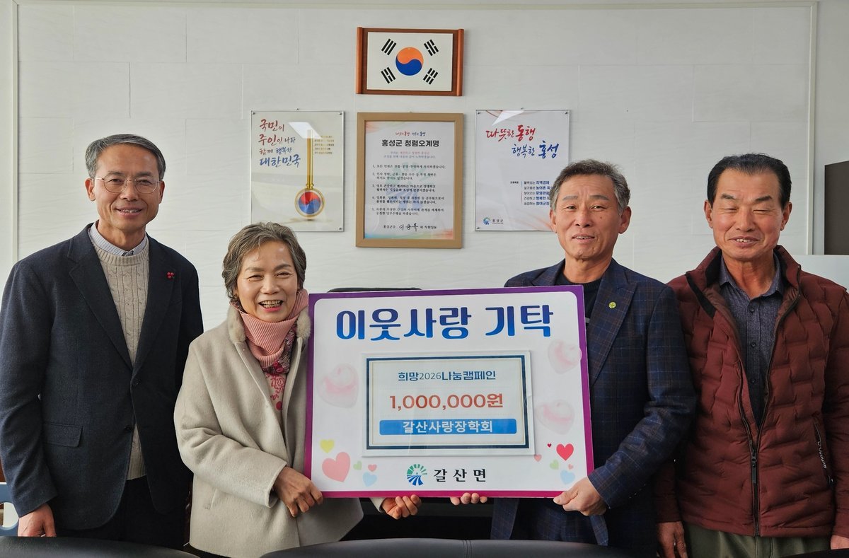 [국회의정저널] 홍성군은 지난 30일 일부 지역주민으로 구성된 갈산사랑장학회가 갈산지역아동센터에 성금 100만원을 기탁하며 지역사회 나눔 실천에 동참했다고 밝혔다.