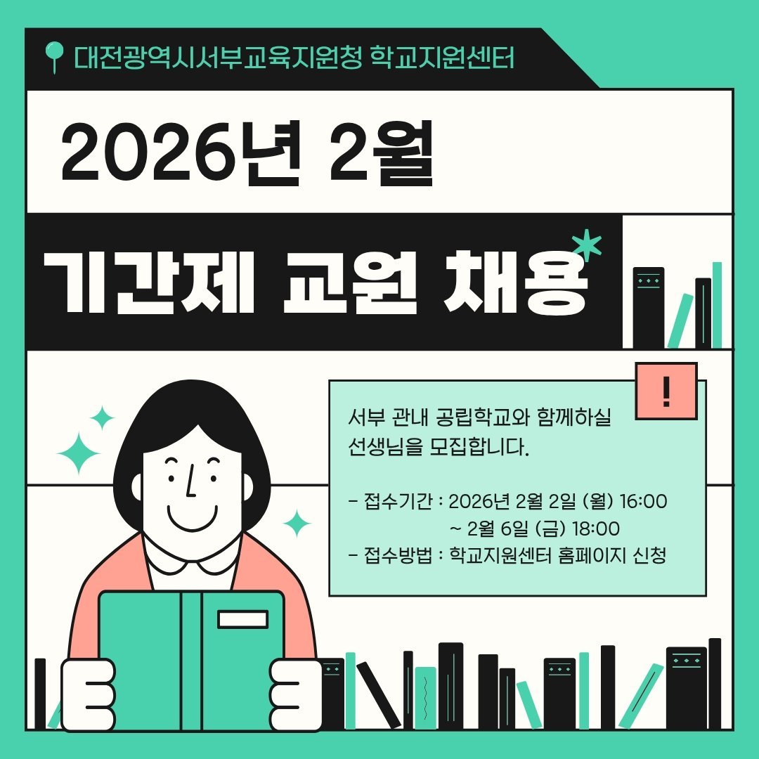 [국회의정저널] 대전서부교육지원청 학교지원센터는 학교 현장의 교원 공백 해소와 행정 부담 완화를 위해 ‘2026년도 제1차 관내 공립학교 기간제 교원 공개 채용’을 실시한다고 밝혔다.