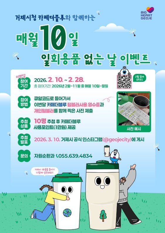 해당 이벤트는 거제시청 내 카페더블루에서 텀블러로 음료를 주문하고 해당 영수증과 텀블러를 같이 찍은 사진을 큐알코드로 제출하면 매월 10일 마다 10명을 추첨해 카페더블루 사용포인트 1만원을 제공한다는 내용이다.