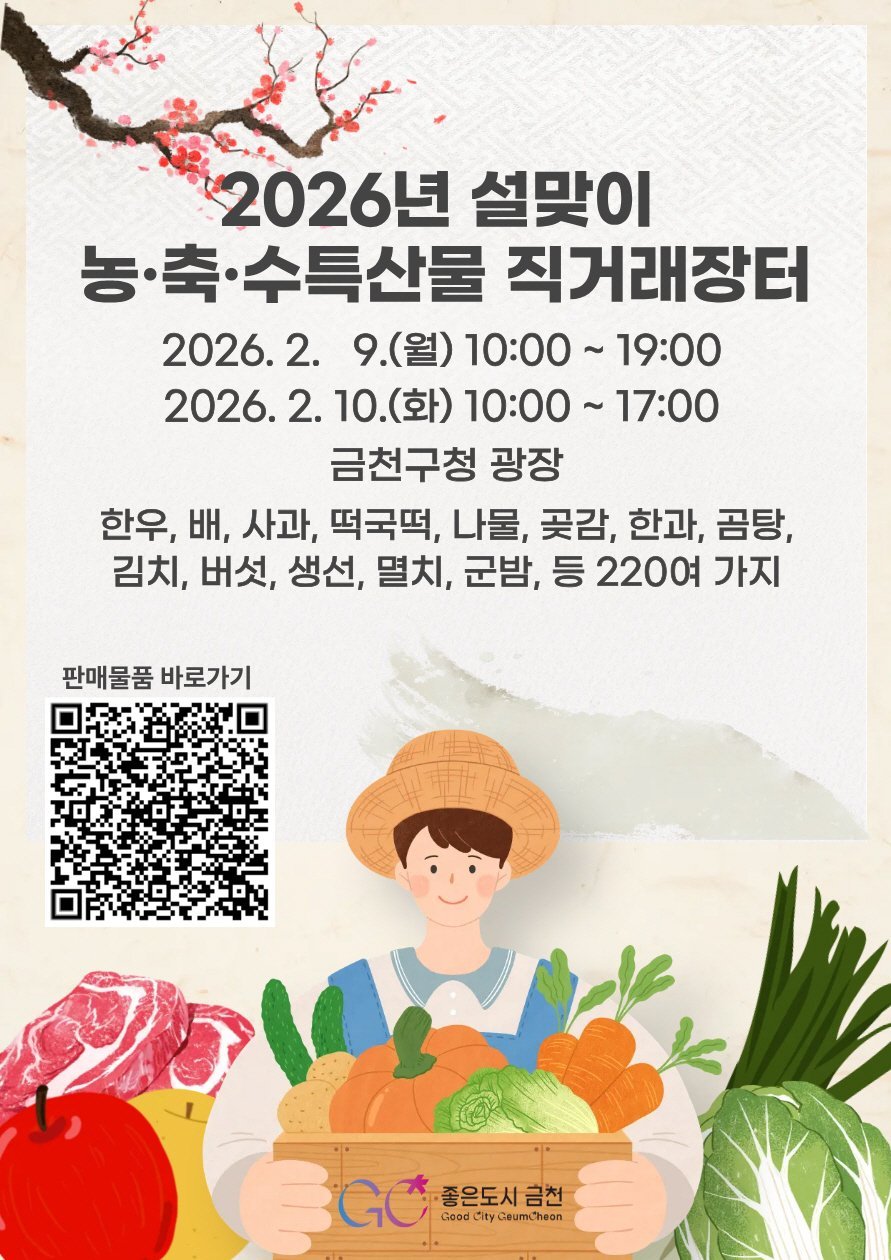 [국회의정저널] 금천구는 설 명절을 앞두고 9일부터 10일까지 이틀간 금천구청 광장에서 '2026년 설맞이 농·축·수특산물 직거래장터'를 연다고 밝혔다.