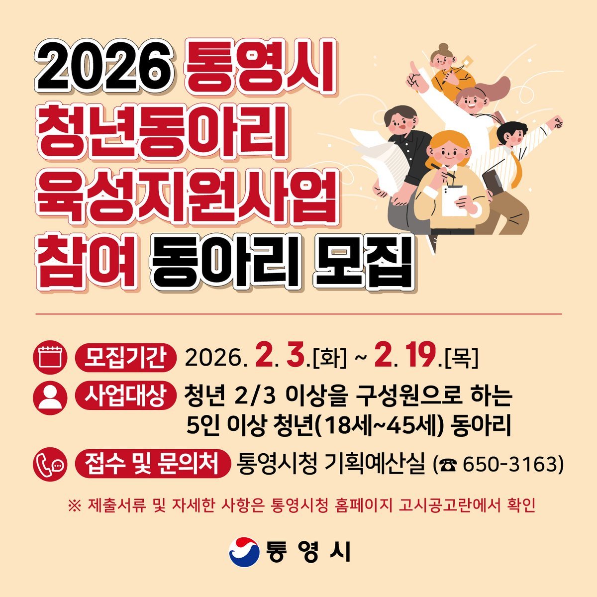 이번 사업은 통영시에 거주하거나 생활권 내 대학 및 사업장에서 활동하는 18세 이상 45세 이하의 청년을 대상으로 동아리 활동에 필요한 지원금을 제공하는 프로그램이다.