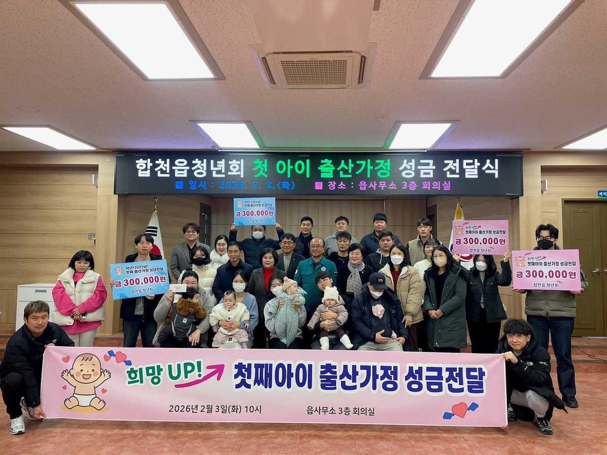 합천읍청년회 유성율 회장은 "첫아이의 탄생을 진심으로 축하드리며 이번 성금이 출산가정에 작은 응원과 힘이 되길 바란다"며 "앞으로도 합천읍청년회는 아이와 부모가 함께 웃을 수 있는 따뜻한 지역사회를 만드는 데 앞장서겠다"고 말했다.