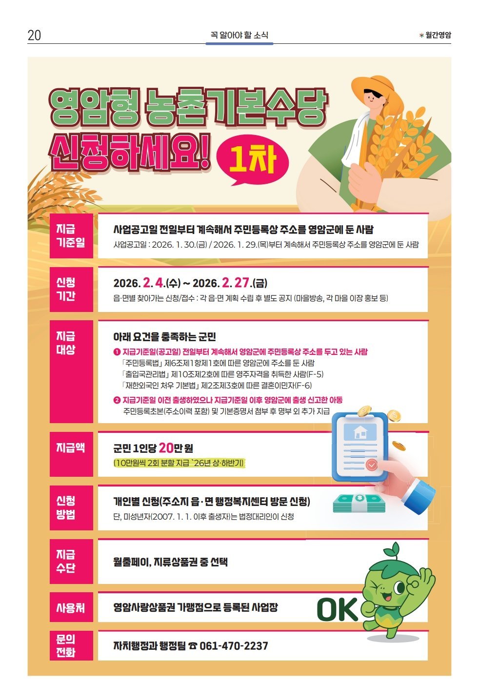 이번 1차 농촌기본수당은 주민등록상 올해 1/29일부터 영암군민인 사람에게 1인당 10만원을 지급하고, 결혼이민자, 영주자격 취득자도 포함된다.
