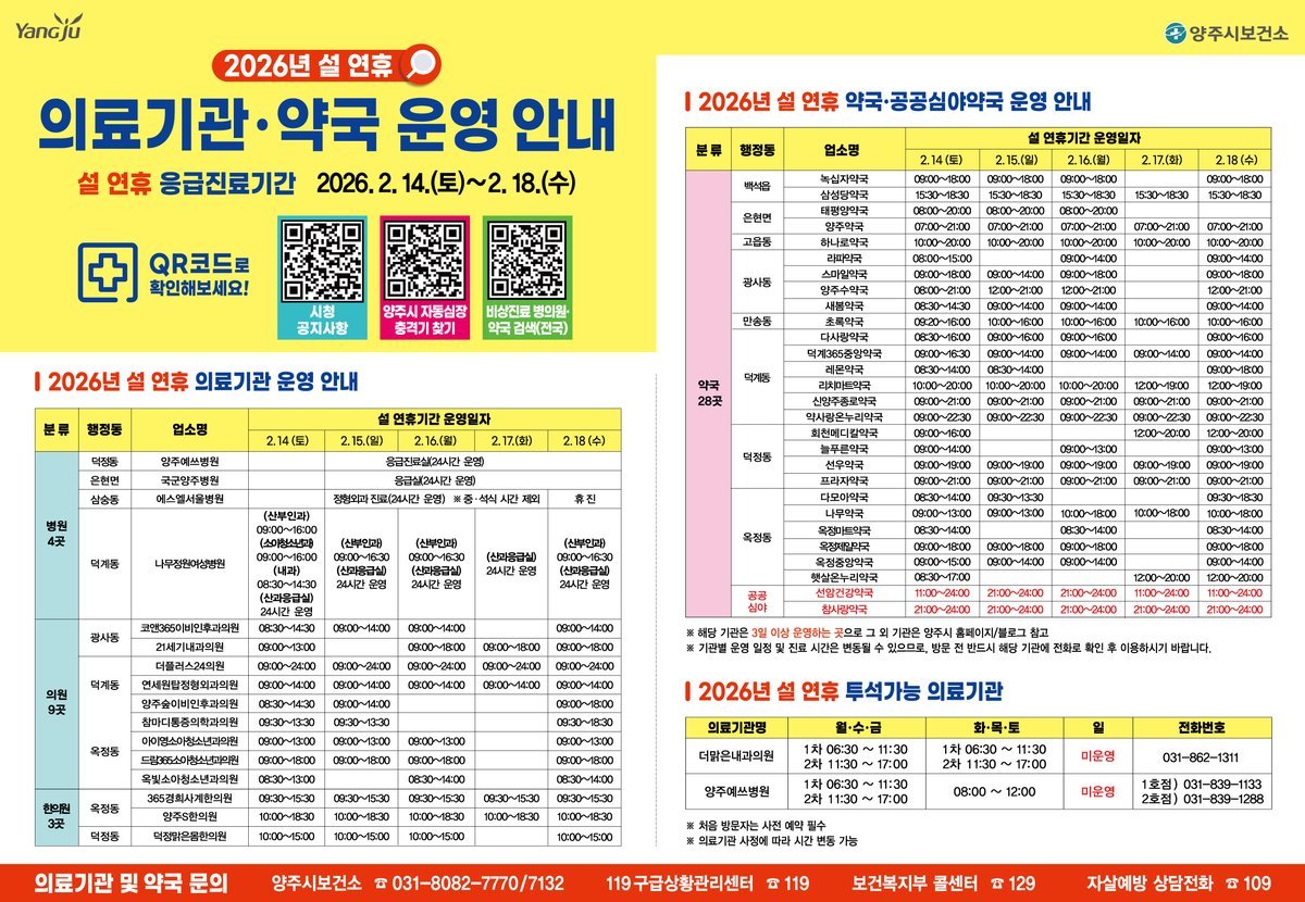 설날 연휴 기간 운영 의료기관 및 약국 정보는 △양주시 보건소 △119구급상황관리센터 △보건복지부 콜센터를 통해 문의할 수 있다.