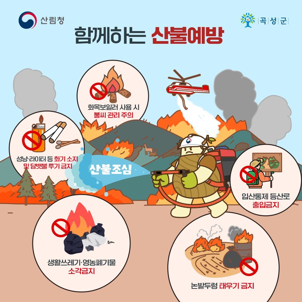 특히 영농폐기물 및 생활쓰레기 소각 등 일상 속 작은 행동이 산불로 이어질 수 있는 만큼 군민들의 적극적인 협조가 무엇보다 중요하며 산불 발견 시에는 즉시 119 또는 군청 상황실로 신고해 줄 것을 당부했다.