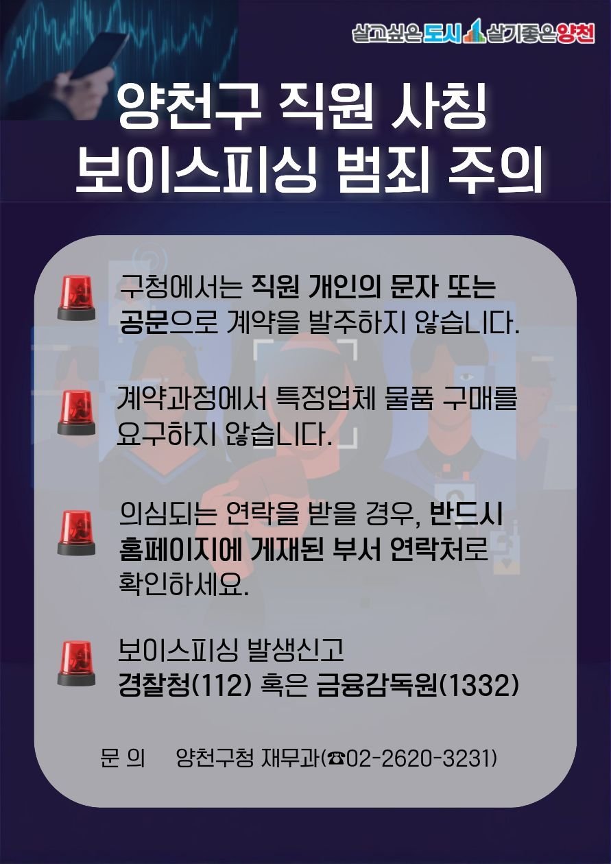 이 밖에 계약과 관련해 보이스피싱을 포함한 공무원 사칭 관련 사항은 양천구청 재무과로 문의하면 된다.