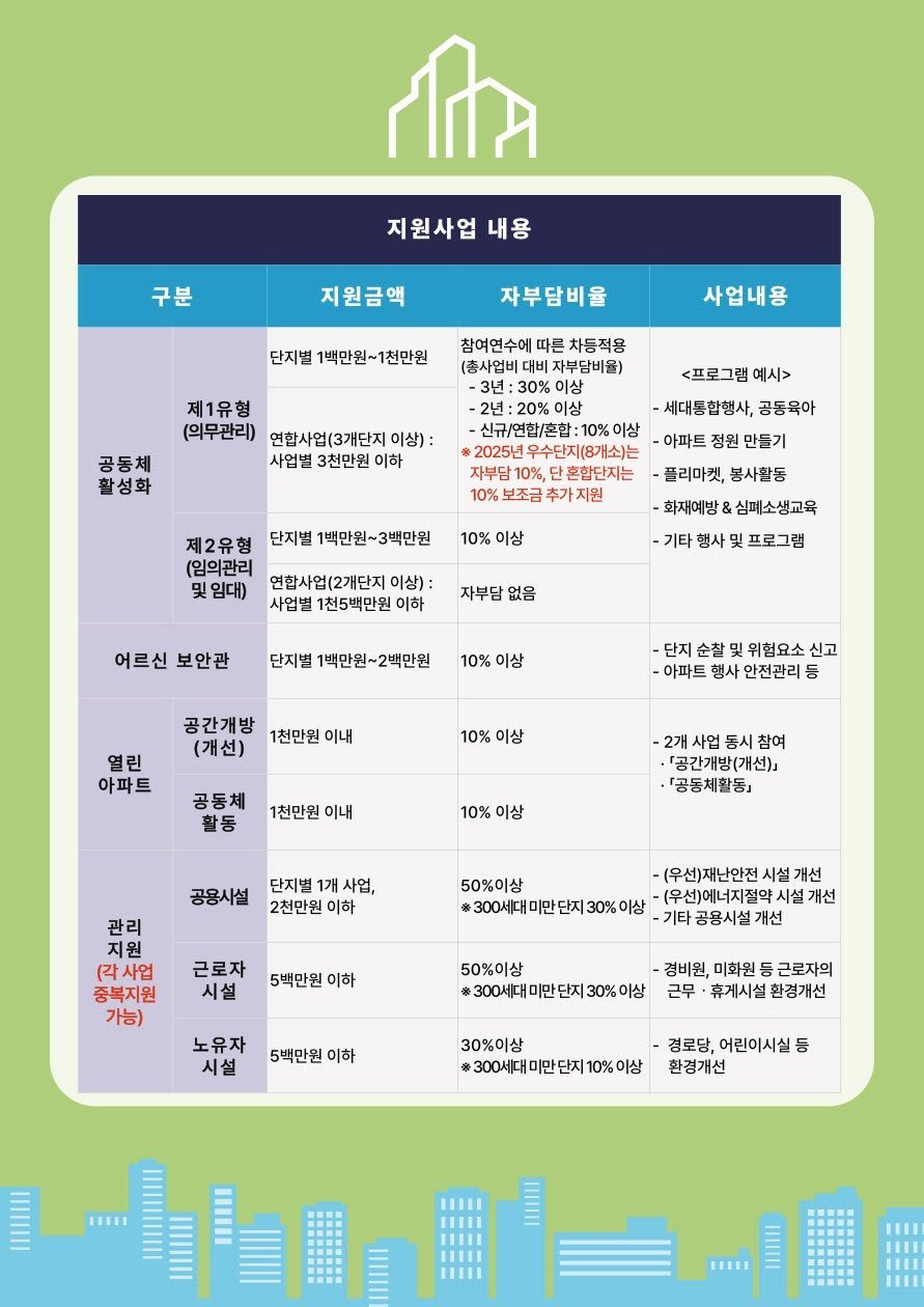 300세대 미만 소규모 단지에 지원을 확대해 상대적으로 취약한 단지의 생활 여건을 실질적으로 개선하는 데 중점을 둘 예정이다.