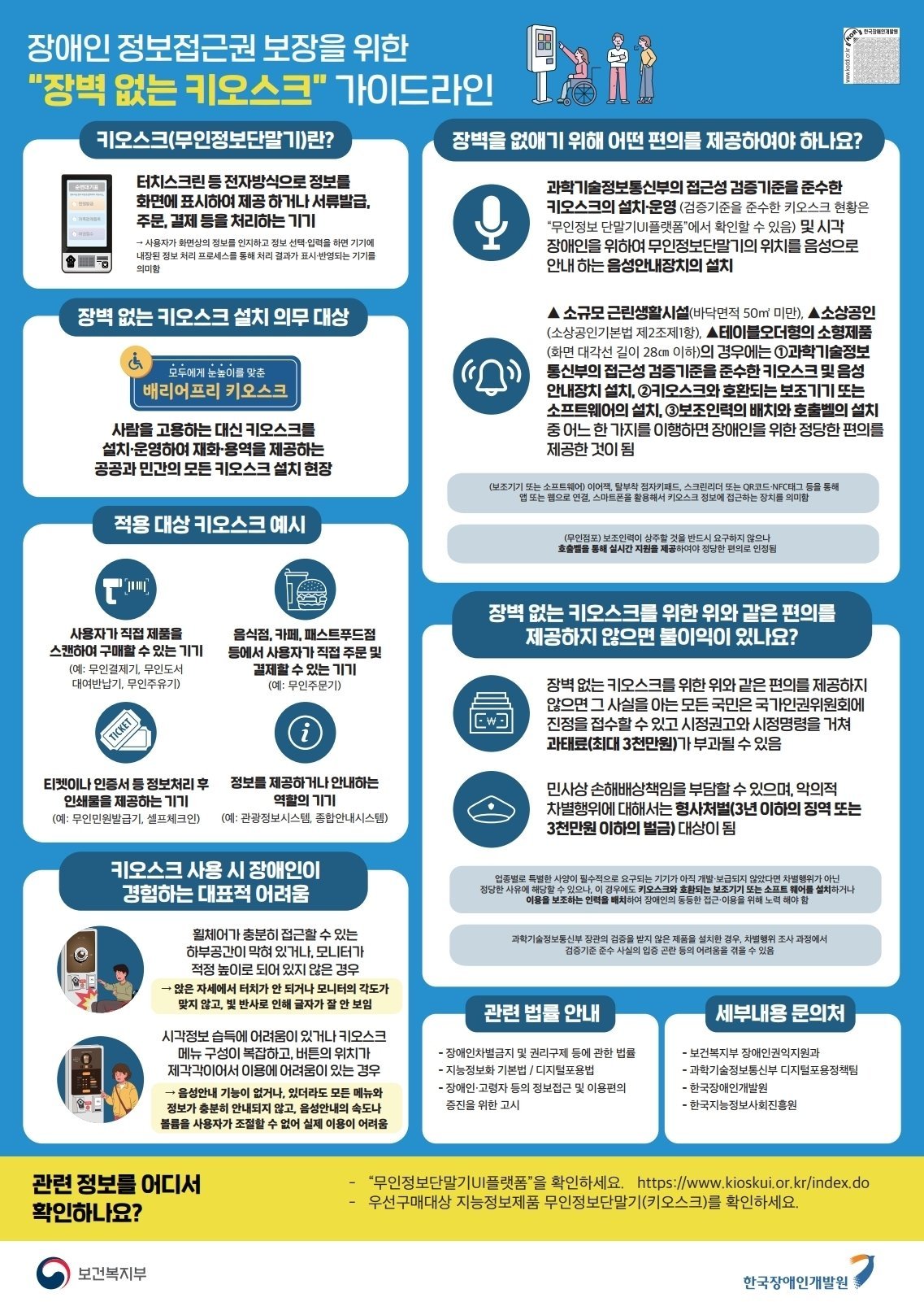 최근 개정된 ‘장애인차별금지 및 권리구제 등에 관한 법률’시행령에 따라, 공공과 민간에서 키오스크를 설치·운영하는 경우 접근성 검증 기준을 충족하는 기기를 사용하고 시각장애인을 위한 음성 안내 장치를 갖춰야 한다.