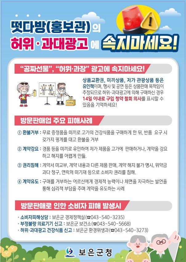 안진수 경제정책실장은 “방문판매업으로 인한 고가 물품 구매 등 어르신 피해를 사전에 차단하는 데 중점을 두고 있다”며 “의심스러운 방문판매 행위나 불법 홍보관을 발견할 경우 즉시 군청이나 관계 기관에 신고해 주시길 바란다”고 말했다.