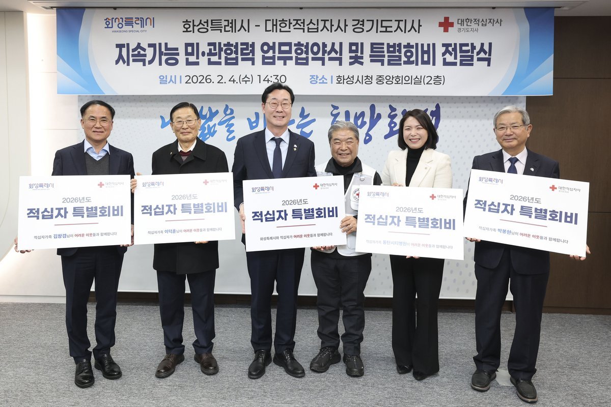 [국회의정저널] 대한적십자사 화성특례시지부 시범 운영 추진 재난구호·취약계층 지원 등 지역 인도주의 사업 협력 2026년도 적십자 특별회비 전달식 함께 진행 화성특례시와 대한적십자사 경기도지사가 4일 화성시청에서 지속가능한 민·관협력 거버넌스 구축을 위해 업무협약을 체결했다.