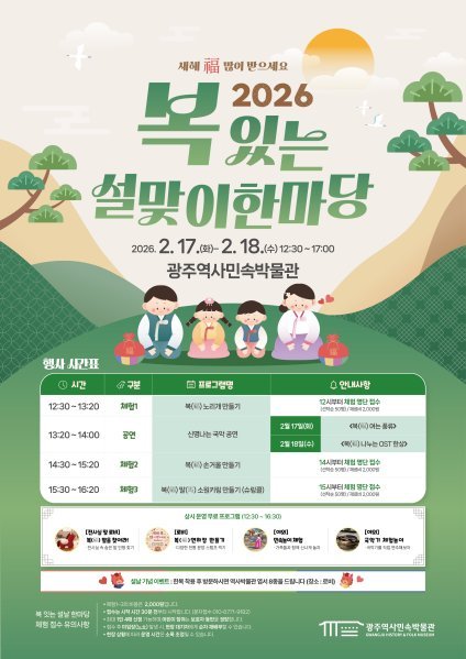 [국회의정저널] 광주광역시 역사민속박물관은 민족 최대 명절 설날을 맞아 ‘2026 설맞이 한마당’을 역사민속박물관 일원과 마한유적체험관에서 각각 운영한다.