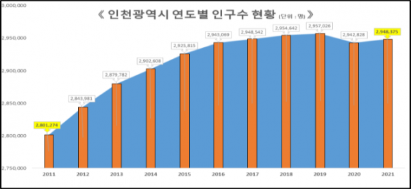 통계청 행정구역별 주민등록인구 통계자료에 따르면 2021.12월말 인천시의 주민등록인구는 2,948,375명으로 2020.12월말 2,942,828명보다 5,547명이 증가했다.