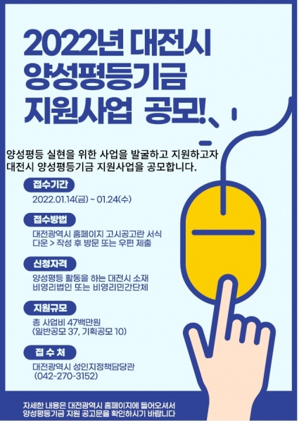 [국회의정저널] 대전시는 양성평등 촉진과 여성의 권익 증진을 위한‘2022년도 양성평등기금 지원 사업’을 공모한다고 밝혔다.