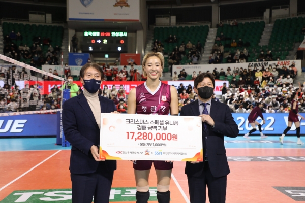 KGC인삼공사프로배구단이 21-22시즌 ‘크리스마스 스페셜 유니폼’ 자선 경매 행사 수익금 전액을 지역 소외계층에 기부했다.