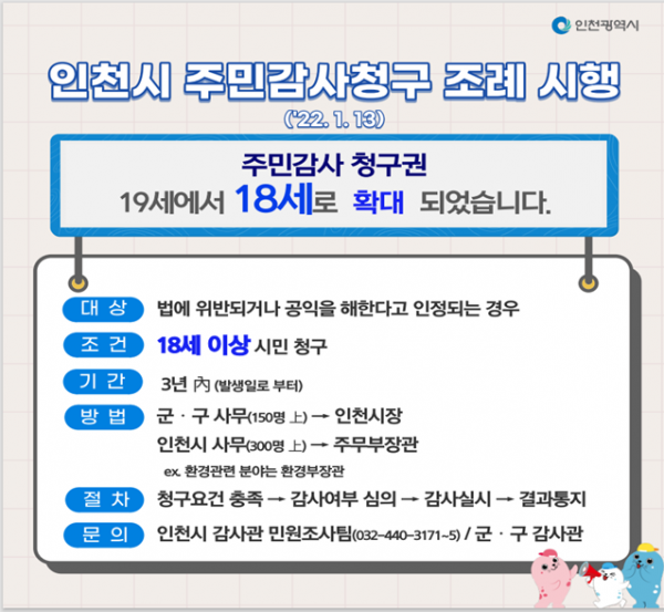 [국회의정저널] 인천광역시는 주민감사 청구 연령기준 하향 및 청구기간 완화 등의 법적 근거를 담은‘인천광역시 주민감사청구에 관한 조례 일부개정’을 1월 13일 시행한다고 밝혔다.