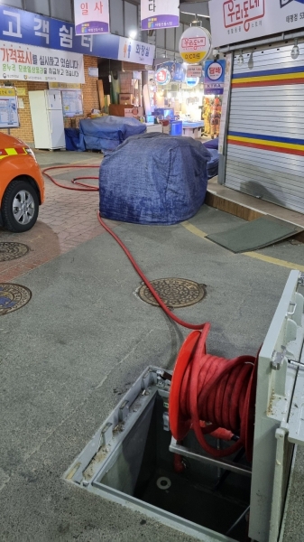 우선 화재 점포 안에 설치된 화재알림시설이 연기를 감지, 119로 신고 되어 출동 중 소방차량 진입이 어려울 것으로 판단, 출동한 소방대와 시장내 자율소방대가 함께 비상소화장치 호스릴을 30m 가량 전개해 진화에 성공해 큰 불을 막을 수 있었다.