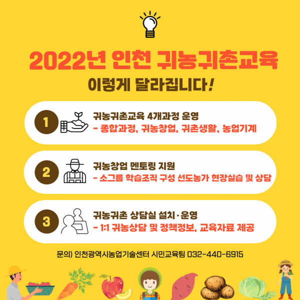 인천시 농업기술센터에서는 전국 귀농귀촌 인구가 증가세로 전환되고 인천 귀농귀촌교육 수료자의 영농 정착률이 증가함에 따라 귀농귀촌교육 확대, 귀농창업 멘토링 지원, 귀농귀촌 상담실 설치·운영 3개 분야로 나눠 귀농귀촌 지원체계를 강화할 예정이다.