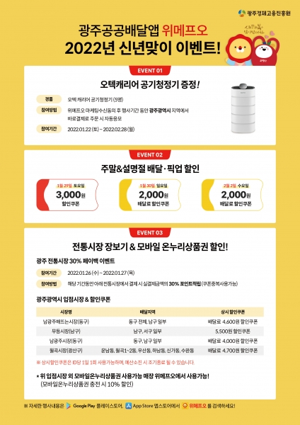 [국회의정저널] 광주광역시는 광주공공배달앱 ‘위메프오’에서 설 명절을 맞아 주문 고객을 대상으로 다양한 이벤트를 진행한다고 밝혔다.