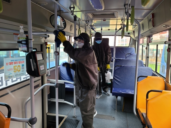 시는 지난 1월 3일부터 전문방역업체 소속의 전문인력 89명을 기점지 19곳에 배치하고 운행하고 들어오는 시내버스 984대를 대상으로 하루 5~6회에 걸쳐 꼼꼼히 방역을 실시하고 있다.