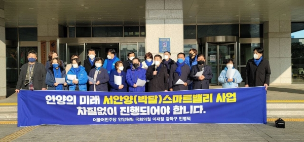 [국회의정저널] 안양원팀 더불어민주당 국회의원 강득구의원을 비롯한 안양시 도·시의원들이 27일 오전 안양시청에서 서안양스마트밸리의 중단없는 투명한 사업추진을 촉구하고 ‘안양시국민의힘 3개 당원협의회’의 마타도어식 주장의 중단을 요구하는 기자회견을 가졌다.