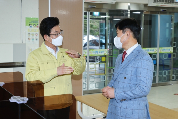 이 날 허태정 시장은 자가진단 시스템 재개 등교 시 발열체크와 손소독 실시 여부 마스크와 손소독제 등 방역물품 학교 내 비축 상황 교실 내 책상 간격 유지 급식실 가림막 설치 현황 등을 살폈다.