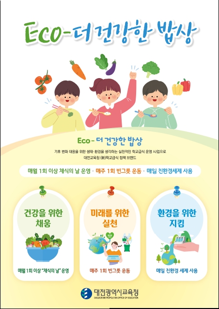 “ECO-더 건강한 밥상”이란 육류 위주 식습관과 채소류 기피 현상으로 날로 심각해지는 학생 건강 문제를 해결하고 기후 위기와 환경재난 대응에 동참하기 위해 마련한 대전교육청의 학교급식 정책 브랜드다.