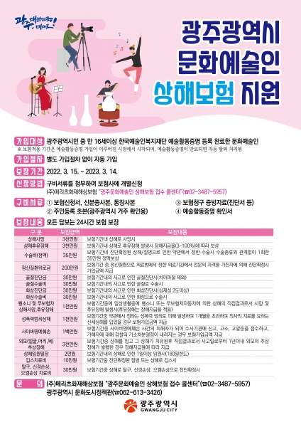 보험가입 기간은 2022년 3월15일부터 2023년 3월14일 자정까지 1년이며 가입대상은 한국예술인복지재단에 예술활동증명등록을 완료한 만 16세 이상 광주시민으로 별도 절차 없이 자동 가입된다.