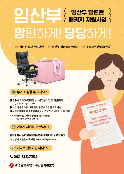 ‘임산부 맘편한 패키지’는 관내 소재 300인 미만 중소사업장에서 근무하는 임신부에게 임신부 체형에 맞춰 접이조절이 가능한 임신부 전용의자 무료 대여, 임신부의 직장생활에 필요한 임신부 직장생활꾸러미 제공, 근무환경 개선을 위한 모·부성 노무컨설팅 등 3개 분야를 종합 지원하는 사업이다.