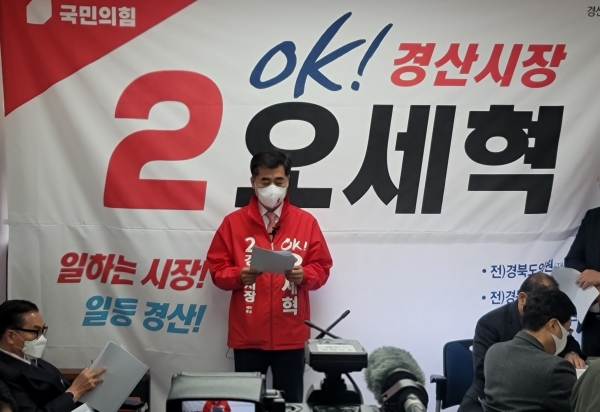 [국회의정저널] 6.1지방선거에서 경산 시장 출마를 선언한 국민의힘 오세혁 예비후보가 22일 경산시청에서 기자회견을 갖고 출마를 공식화했다.