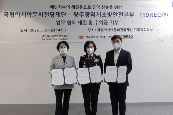 이번 협약에 따라 시 소방안전본부가 법적 내구 연한이 지난 폐방화복을 무상으로 양여하면 119레오㈜에서 새 상품으로 제작하고 유통과 판매는 국립아시아문화전당재단이 맡아 진행한다.